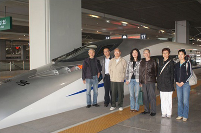 在高速列车前合影