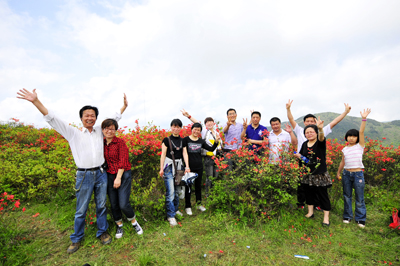 会员们一行20余人来到遂昌县高坪乡桃源尖欣赏“万亩杜鹃”。只见山上杜鹃红遍,满目风光无限。连绵峰峦,漫山遍野,花团锦簇,蔚为壮观。会员们在花间穿行,或抱着合影,或蹲身取景,情不自禁地欢呼雀跃,兴奋的心情在花间传动。