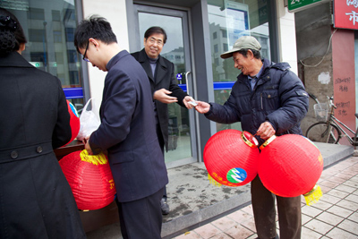 2月5日上午,两个支部的服务队又走进台州市中心镇——临海市桃渚镇,为前来赶集的居民送上大家喜闻乐见的春联、灯笼和剪指刀等小礼品,给大家捎去节日的真诚祝福。并现场提供崭新人民币、破损币、零钱等兑换,及农村金融业务咨询等服务。活动现场人头攒动,人们争先恐后领取春联、灯笼及其他小礼品。