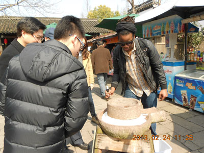 2月24日,是中国传统的元宵佳节。为了使美国学子更好地体验中国的传统佳节,王老师、朱老师两家人作了精心安排。早上9:30,带上美国学子来到了杭州美丽的西溪湿地公园,游览福堤、绿堤、河渚街。福堤、绿堤沿途各种灯笼造型各异,琳琅满目,美国学子开心极了,对中国的一切表现出了极大的兴趣。在河渚街上,他们看了中国传统戏剧表演,了解龙舟的历史,亲手参与制作麻糬。朱老师、王老师还请他们品尝了河渚街上的许多美食。