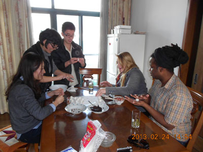 为了使美国学子融入中国家庭,深入体验中国的传统佳节,下午,朱老师邀请美国学子来到了自己的家,品尝下午茶,四个中美学子畅谈人生、畅谈梦想,相谈甚欢。与此同时,朱老师取出事先准备好的包汤团食材,中美学子间又进行了一场别开生面的包汤团PK赛。包汤团,品汤团,美国学子深刻体验了中国传统佳节的过程。整个客厅欢声笑语,欢乐的气氛不断推向高潮,中美两国人民的友谊必定源远流长!