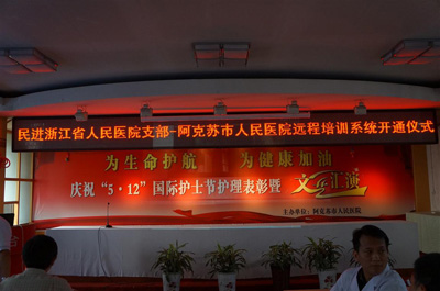 民进浙江省人民医院支部——阿克苏市人民医院的远程培训及会诊系统也在张大宏主任的积极筹划下顺利完成并举行了开通仪式,当天上午,浙江省人民医院手术室内泌尿外科的手术操作同步直播到阿克苏医院报告厅内,此举赢得了阿克苏市委市政府的高度肯定与赞誉。阿克苏市郑莹副市长亲自前往观摩并讲话。