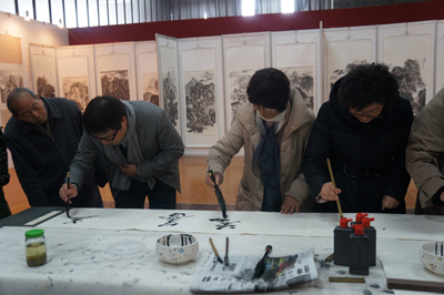 上午,与会人员参观了在嘉善文化馆举行的“水墨江南---冯强个人画展”。到场领导与嘉宾以同写“善”字的方式,拉开了此次画展及三地艺术家座谈会帷幕。
