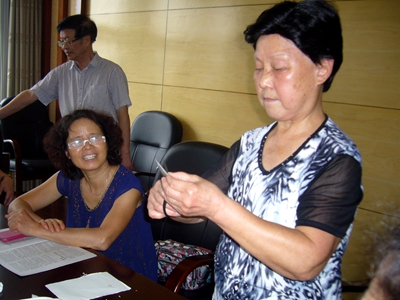 王话敏介绍了自己热爱和从事剪贴、塑刻事业的经历。她向大家展示了自己的代表作,特别是曾经获得金奖的“苍龙戏珠” 和用快餐盒制作的“仙鹤亮翅”,令大家赞叹不已。随后,王话敏为大家讲解了手工制作、废物利用方面的知识,在她的指导下,大家动手制作了以废纸、快餐盒为原料的简单的剪贴作品。