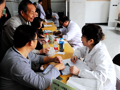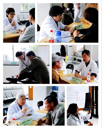 义诊从上午八点半开始,门诊大厅共开出12个诊台,特设咨询处为患者提供服务,并现场为患者量血压、测血糖。参加义诊的医生们都早早来到了自己的岗位,省立同德医院的中医内科专家韩冬和中医肿瘤科专家曹宝珍都是第三次参加“名医下乡送健康”义诊活动,在附近患者中已经有了一定的知名度,一到现场就有患者前来复诊。此次义诊约为一百多位农村患者提供了诊断和咨询。