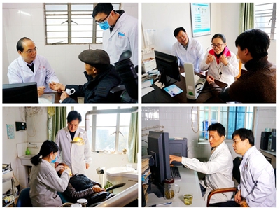 民进医卫专家施培华、倪海祥、傅柏平、许茂盛(从左至右、从上至下)开展义诊和现场教学指导