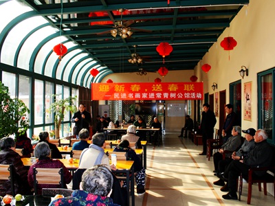冬日的暖阳,新年即至的喜庆笼罩在绍兴市区常青树养老公馆里,2月12日下午,民进绍兴市委会在此举办了“迎新春,送春联——民进书画家进社区”活动。市委会专职副主委孟建新,绍兴市兰亭书法博物馆馆长喻革良、绍兴市尚意水墨书画院院长董祖尧及著名书画家会员孙小东、宋鸿斗及市直文艺支部部分会员一同参加了活动。