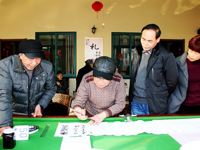 随后,老年朋友们围簇在4位书法家周围,观看他们现场挥毫创作,一面啧啧称奇,一面传递着书法家们已写好的春联。愉悦的气氛,热闹的场面深深感染着身边每一个人,一个多小时里,50多幅春联相继完成,许多老年朋友还自发一起朗读了由宋鸿斗老先生撰写的《老人健康歌》。绍兴电视台对本次活动进行了跟踪报道。
