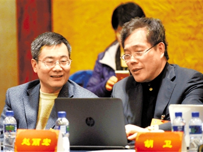 日,在全国政协小组讨论会上,我省全国政协委员赵光育(左)和赵丽宏(右)就政协工作创新进行交流。