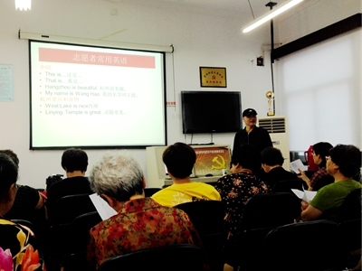为了满足志愿者们的英语学习需求,提升志愿者的服务质量,紫阳街道社区分院邀请杭十中资深英语教师叶善明为紫阳公益志愿者及市民授课。第一堂英语课,叶老师为大家量身定制的就是用英语问路与指路。志愿者们年纪最大的已有70岁,虽然他们不会英语,但学习起来一点儿也不含糊,在笔记本上认真记着发音,嘴里反复背诵,短短的一个小时,大家就学习了基本的问路与指路用语,有的老人说,回家后还要消化一下,和孙子一起好好练习。
