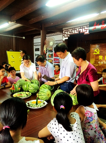 茅畲逸夫小学是台州民进的品牌社会服务——黄岩区总支“携手留守儿童,助飞‘小山鹰’”活动的助学基地。炎炎夏日,黄岩区总支在逸夫小学设立的“民进农技种植基地”迎来西瓜大丰收,总支以此为契机,开展“欢乐之鹰”活动。黄岩民进科技服务队举办西瓜品鉴会,指导孩子们辨别西瓜品质和成熟度、制作西瓜拼盘,并交流、分享西瓜种植的心理体验。黄岩民进教育服务队在总支的助飞“小山鹰”成长心理咨询室开展心理沙盘游戏活动和心理健康团体辅导活动,孩子们反响热烈。