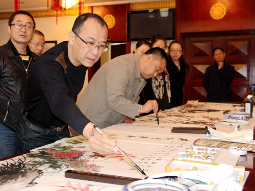 在本溪,两地民进组织及开明画院联合开展书画笔会,挥毫泼墨寄情民进成立70周年暨抗战胜利70周年。本溪市政协副主席李振亮,民进本溪市委会主委张文辉、专职副主委贾宏出席笔会。