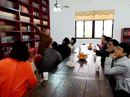 学习结束后,全体会员前往所前天乐寺参观。在寺院住持释如州法师的带领下,会员们参观了寺院,见证了寺院开展“文明敬香”工作以来的成果。在拥有两万多册藏书的佛学图书馆内,会员们就如何更好地弘扬中国传统文化与法师进行了交流和探讨,对如州法师在弘扬中国传统文化、倡导全民阅读、提高自我修为等方面做出的努力表示赞赏,并表示要从自我做起,爱阅读、会演习、勤思考。
