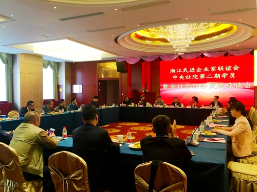 4月10日下午,浙江民进企业家联谊会中央社院第二期学员磐安社会经济发展座谈会在孔正洪会员企业——磐安大盘山温泉山庄召开。杭州市政协副主席、民进浙江省委会副主委赵光育,省委会社会服务处处长韩依群,民进金华市委会专职副主委吴瑞成,磐安县政协副主席、统战部长杨文秀,磐安县工商联主席韦鸿飞,民进磐安县总支主委徐松青及浙江民进企业家联谊会中央社院第二期部分学员共三十余人参加了会议。会议由韩依群主持。
