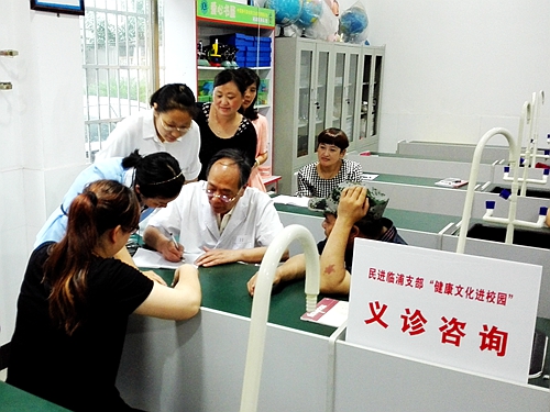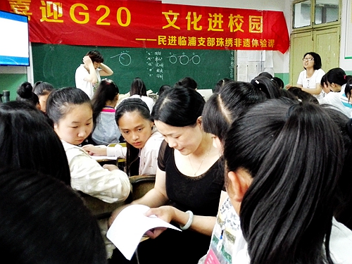 随后,民进会员楼雁飞医师热情为师生们开展义诊咨询,对于老师们提出的常见职业病的预防,楼医师给予耐心解答与示范。设在支部会员盛新农担任院长的民进省市区同心医卫基地为师生们开设了《防溺水急救常识专题讲座》,俞国火副主任医师通过防溺水知识的传授、参与式的急救训练,让学校的师生们更懂得了自救与互救的重要性。同时,萧山珠绣非遗项目的传承人王丽华为高段部的同学们开设了以迎G20为主题的珠绣非遗体验课,让学生们感受到了传统文化的魅力所在。