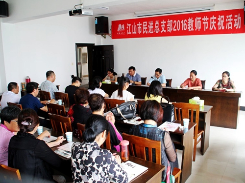 活动邀请江山市教育局副局长毛建军作报告。他向在座的教师和教育工作者表示亲切的慰问和崇高的敬意,对一贯大力支持教育工作的民进江山总支表示由衷的感谢。毛建军在报告中全面系统地介绍了江山市近年来的教育工作发展情况,“十三五”教育规划的主要指标、措施以及目前教育工作要抓好的主要项目等,让大家深受激励和鼓舞。