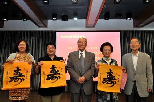 今年,省直共有21位老会员进入80周岁行列,3位老会员迈入90周岁。按照以往传统,老龄会员联谊会为他们制作了祝寿卡,由刘毅副主委和毛昭晰老主委亲自为到会的老会员及代表颁发。浙一医院退休支部的陆琦教授今年已经96岁,仍耳聪目明,精神矍铄,他亲笔写了三张斗方“寿”字,登台送给三位90周岁老寿星所在的支部代表,祝全体老会员健康长寿。
