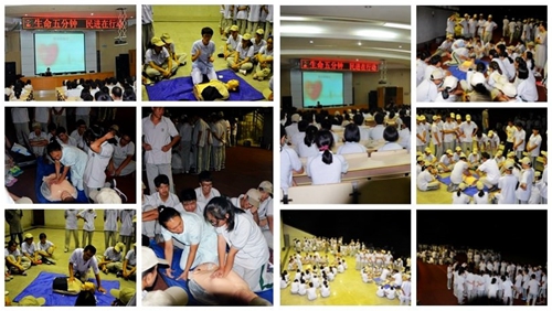 根据心血管病中心发布的《中国心血管病报告2014》显示:我国心血管患病率处于持续上升阶段。目前,每年我国心脏性猝死发病人数超过54万,相当于每分钟约有一人发生心脏性猝死。相关统计显示,猝死等急症约70%发生在家中,25%发生在其他场合,仅有5%发生在医院内。对猝死的急救,时间就是生命。业内一直有黄金五分钟的说法。指心肺复苏和除颤的的关键时期在心脏骤停之后的五分钟内。由于民众普遍缺乏心肺复苏急救知识和技能,心脏性猝死抢救成功率极低,能够抢救过来的患者不足1%。因此,民进天台县支部自2012年启动“生命五分钟,民进在行动”心肺复苏急救知识培训活动以来,坚持对每年暑期军训高一新生开展心肺复苏急救知识培训。