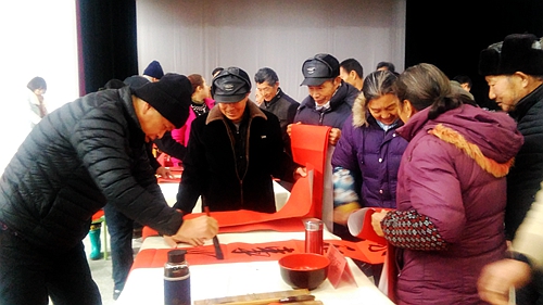 听说民进艺术家们前来送迎春送福,闻讯而来的村民挤满了文化礼堂。书画家们奋笔疾书,挥毫泼墨,喜庆的“福”字,吉祥的春联,喜笑颜开的村民,把细雨濛濛的冬日渲染得暖意融融。活动现场送出春联400余幅,“福”字300多个。幸福村书记徐益民代表村民们对民进组织走进新农村开展文化惠民公益活动表示衷心感谢。