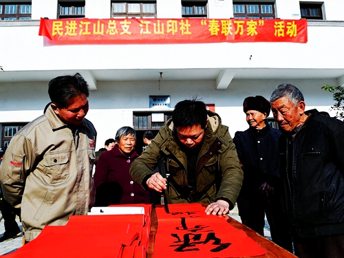 1月13日下午,民进江山市总支部联手江山印社书法家,赴上余镇湖珠村开展“春联万家”活动。总支主委陈林洪、委员王明清、文化支部主委汪益平、科技支部主委汪雪涯参加了活动。