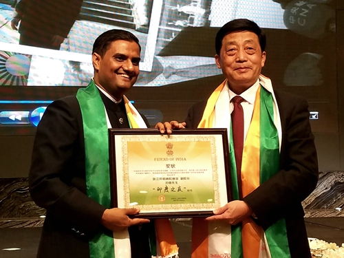 为此,古光明总领事特将“印度之友”称号授予沈曙先生,奖状全文如下:“为表彰其对印度艺术和文化的热爱与理解、以及杰出的绘画才华、向中国人民介绍印度艺术所做的不懈努力、特别是2016年9月G20峰会期间为印度总理阁下创作的油画肖像、特此授予浙江开明画院画家、副院长沈曙先生‘印度之友’称号。”