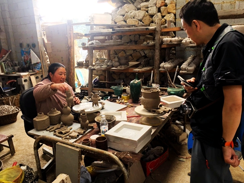 在平塘县文旅局相关人员的陪同下,孙以栋一行先后徒步穿越冰臼大峡谷、大裂谷,打带河天坑群,走访了甲青毛南族村寨、者密镇太平村、场河村交懂组(被列入第一批中国传统村落名录)、牙舟古陶窑、克度镇航龙村、中国天眼景区、白龙乡董林组等地,对平塘县全域的自然人文资源进行了详细的乡野调研,进行了大量的数据采集。在当地向导与村民的介绍下,调研组领略了平塘县绚烂的自然风光、深厚的历史文化底蕴和民俗风貌,对传统村寨进行了多方位全面的影像记录;特别是在克度镇航龙村调研期间,发掘了当地文旅局寻而未遇的克度细篾斗笠,其制作工艺精湛,具有鲜明的民族风格和艺术魅力,在民国时期曾远销东南亚,但是这一重要的物质文化遗产前景堪忧,即将面临断代失传,亟需解决传承与发展的问题。