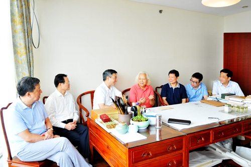 罗富和一行与吴山明围坐在画案旁,茶香袅袅,亲情融融。虽已77岁高龄,吴山明先生依旧鹤发童颜,精神奕奕。