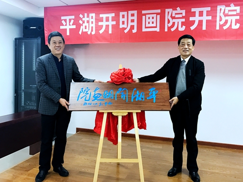 嘉兴开明画院院长王淳、平湖开明画院院长彭正海、中共平湖市委统战部副部长曹冬梅分别致辞,民进平湖市委会主委宋怡玲致答谢词。民进嘉兴市委会副主委顾云祥与沈曙先生共同为平湖开明画院成立揭牌。