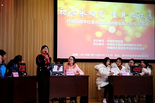 为进一步学习、贯彻党的十九大精神,丰富教学教研活动形式,彰显新教师与时俱进的精神风貌,1月11日,民进柯城区总支部、民进衢州市实验学校支部联合承办 “初心永向党望月心怀远”2017学年初中社会思品新教师专业成长积分赛暨十九大知识竞赛活动。