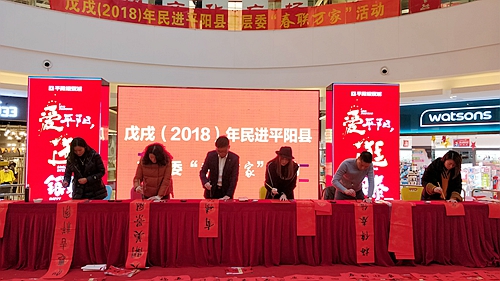 1月27日下午,民进平阳县基层委员会在鳌江镇银泰城开展2018年“送春联进万家”活动。这是基层委2O18年送文化系列活动的开篇之作,平阳民进会员、中国书法家协会会员周荣强协同书法爱好者现场挥毫泼墨,书写春联赠送给鳌江镇的广大市民。