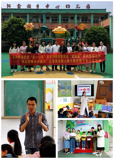 4月26日,为纪念“五一口号”发布70周年,推进“爱阅读”系列活动开展,民进苍南县灵溪教育支部赴凤阳畲族乡开展送教活动。苍南民进会员许燕青、周自德、陈瑶、徐斌、陈方敏,县委统战部干事李青,会员单位太阳人幼儿园岳小红老师等参加活动。
