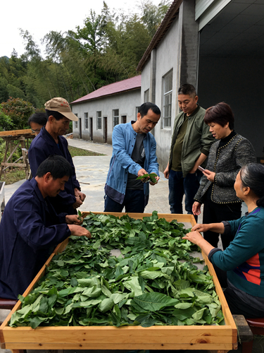 在种植和加工现场,支部会员、柏明娥研究员作为基地技术指导,向大家介绍了青钱柳的历史、食用功效与国内近年来的发展情况,表示计划将针对不同季节叶片中黄酮、多糖、三萜含量的不同进行高附加值产品的研究开发。农场负责人带领大家参观了青钱柳加工设备和整个种植基地,介绍了现阶段基地青钱柳的栽培与加工现状。