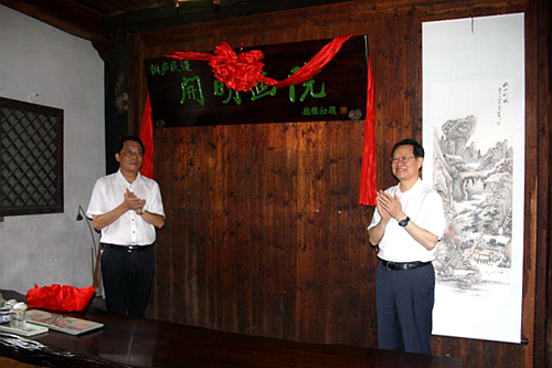 方科代表县委、县政府对桐庐民进开明画院的成立表示祝贺,谢双成、沈曙共同为画院揭牌。