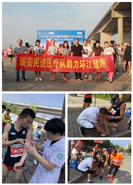 由于天气炎热,临近终点时运动员突发情况剧增。民进瑞安文化卫生支部的医护工作者沉着应对,背起药箱,以高超的专业技能和丰富的实战经验,解决了一个又一个的问题。