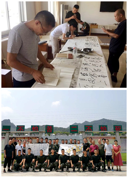 7月29日上午,天台县武警中队会议室翰墨飘香,气氛热烈。在庆祝建军91周年来临之际,民进天台县支部书画界会员带领文艺志愿者服务队,到县武警中队开展现场泼墨送书画活动,抒发对人民子弟兵的热爱。笔会现场共创作书画作品30余幅,当场赠送给中队,受到中队官兵的欢迎。