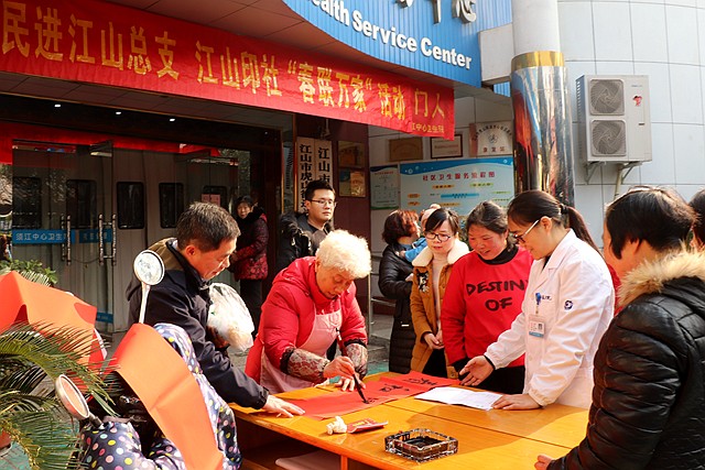 1月28日、29日的下午,民进江山市总支部联手江山印社等单位,分别在虎山城四季青商贸城广场、须江中心卫生院门口开展“春联万家”活动。