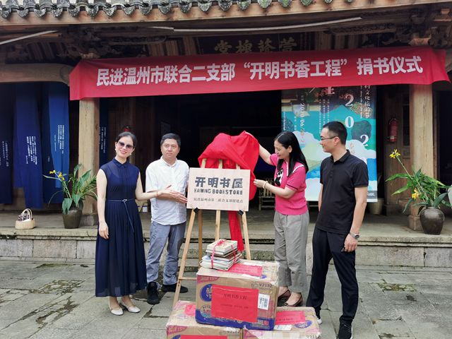 在捐书仪式中,林丽向“乡村儿童图书室”公益项目捐赠由支部会员自发筹集的二手儿童书籍600册。林丽、金戍、张维乐、王晓君一同为徐岙底古村“开明书屋”揭牌。支部社会服务组组长黄胡婕与温州敲敲门绘本馆代表签署了民进“开明”社会服务合作框架协议,探索立足城乡社区服务儿童公益阅读的新模式。