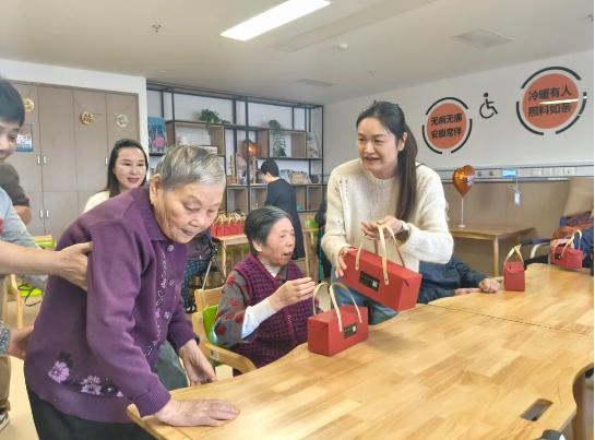 在医养区活动室,老人们其乐融融,欢聚一堂。教育综合支部的会员们早已和老人们拉起了家常,还陪老人们进行康复训练。民进会员、古月素香斋总经理胡琳还为老人们送上了精心制作的素糕点,老人们接过满载心意的礼物,脸上绽放幸福笑容,连连道谢。