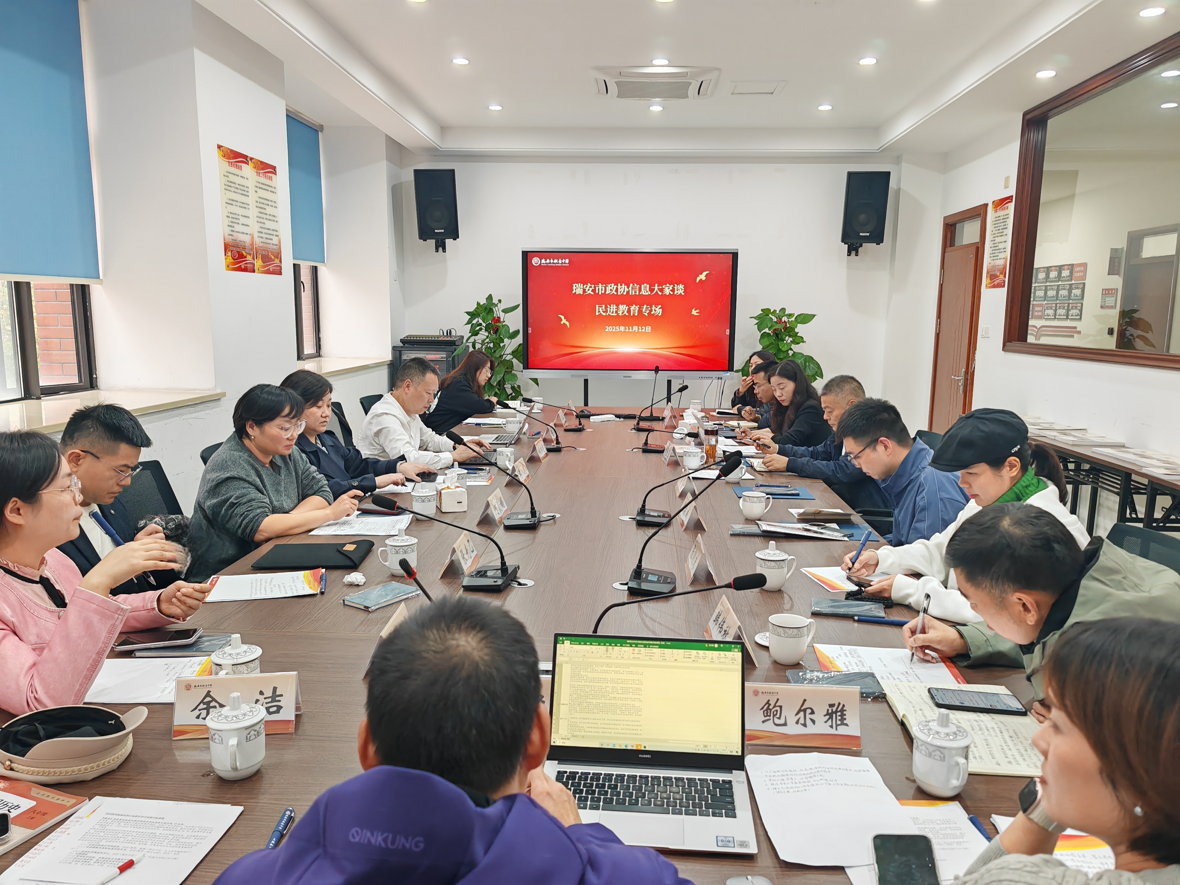 日前,瑞安政协社情民意信息大家谈民进教育专场活动在瑞安市毓蒙中学举行。瑞安市政协副主席林圣强出席会议并讲话,民进瑞安市基层委员会副主委林初存主持,瑞安市政协信息中心、民进教育界会员等近20人齐聚一堂,围绕教育领域热点难点问题展开深入交流与热烈探讨。