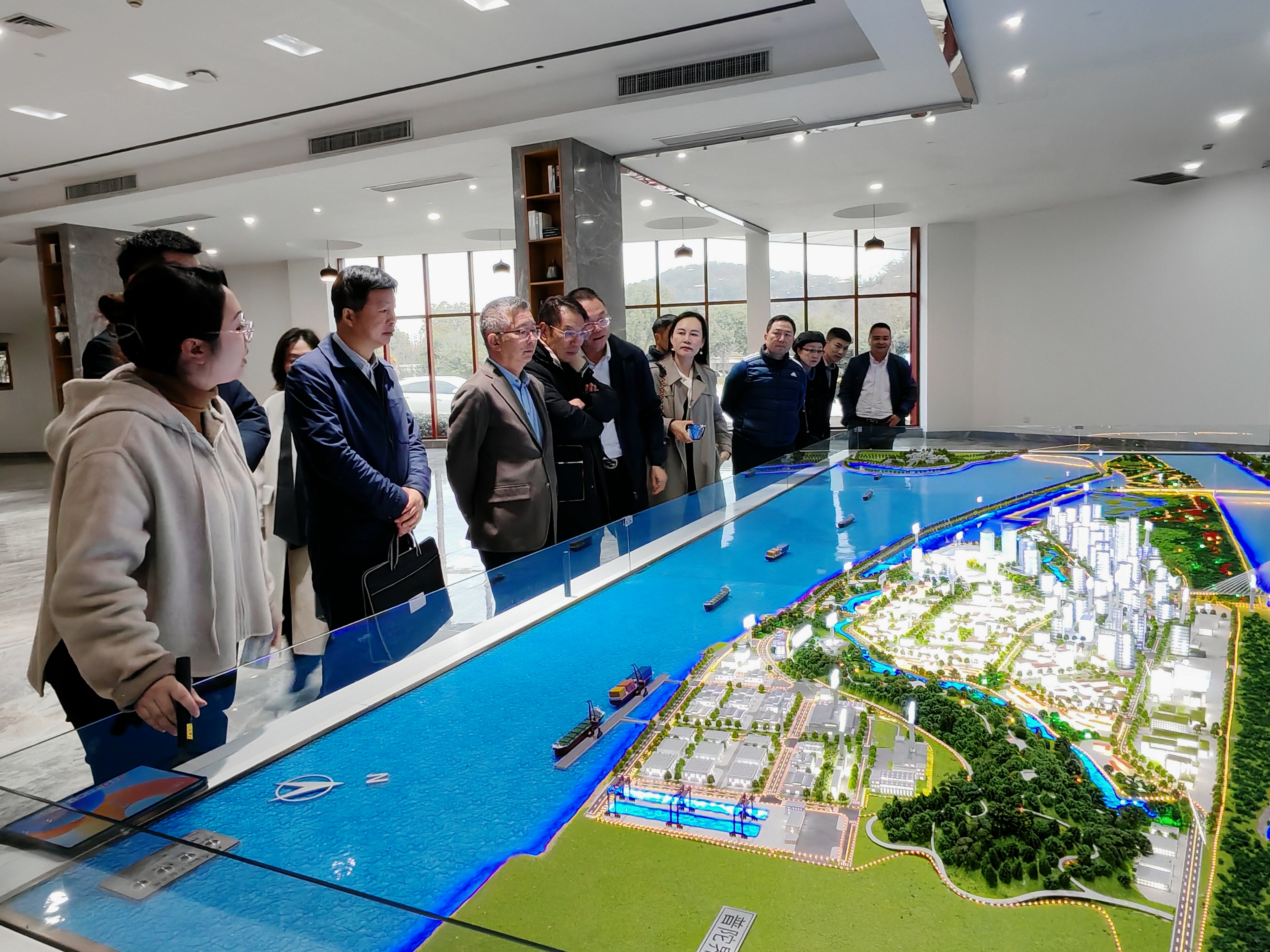 在商务服务中心小干岛指挥部,调研组通过沙盘演示和专题介绍,系统了解小干岛一湾两岸、一轴五廊的开放建设布局。调研组一行围绕产城融合、多业态交互、港埠商街设计理念等关键议题,与指挥部负责人进行深入探讨,并对坚持高起点规划、高标准建设、高水平运营的发展思路表示赞同。