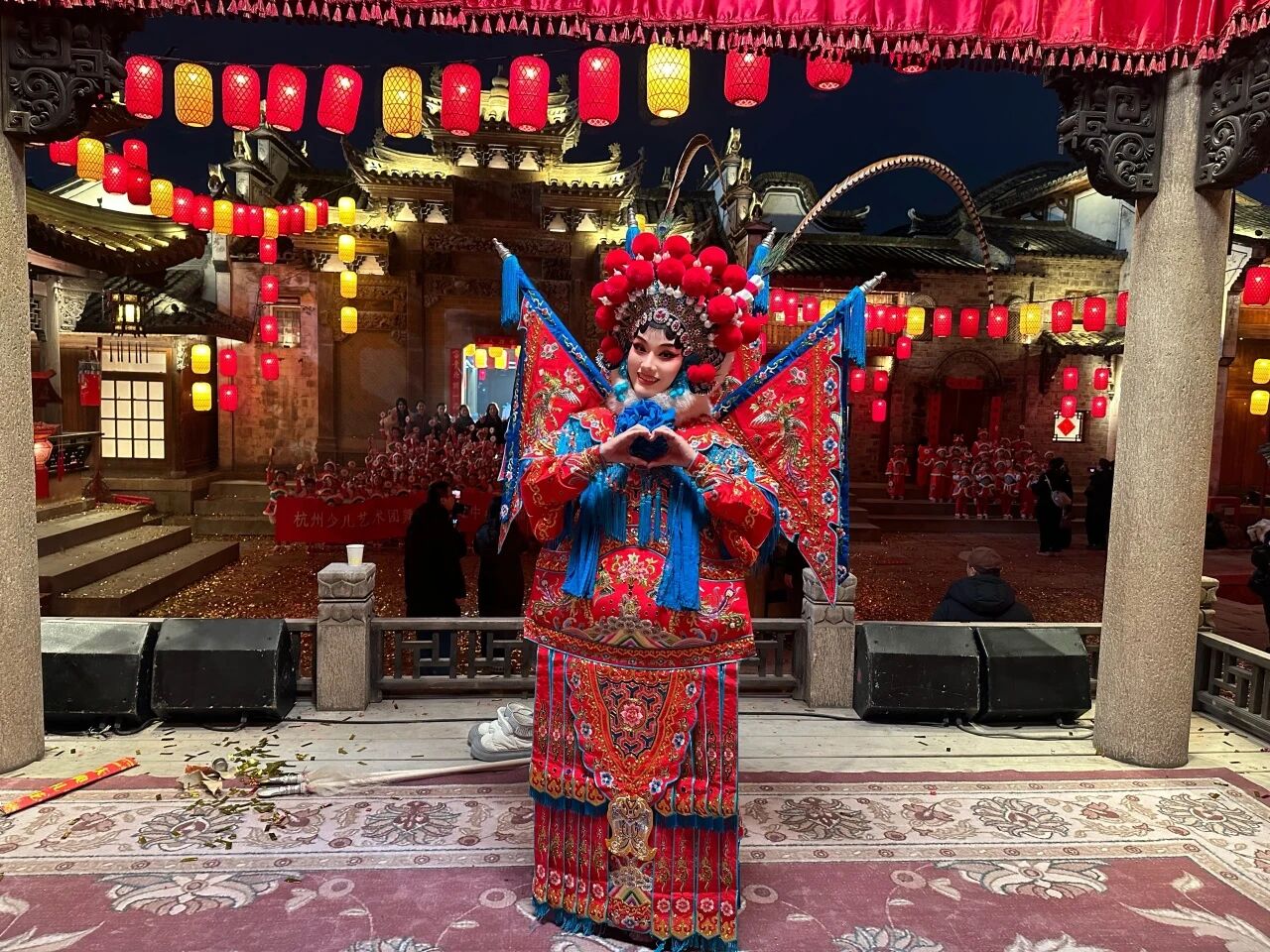 身着以红色为主调、绣有精美纹饰的华丽戏服,头戴缀满红色绒球与珍珠的传统头饰,梅林的扮相尽显古典戏曲之美。在古色古香的建筑背景下,红黄灯笼高挂,她以扎实的功底和深情的演绎,将穆桂英这一巾帼英雄形象塑造得栩栩如生,更巧妙融入义乌人“勇闯天下、忠勇报国”的精神内核,成为整场晚会中一道亮丽的风景线。