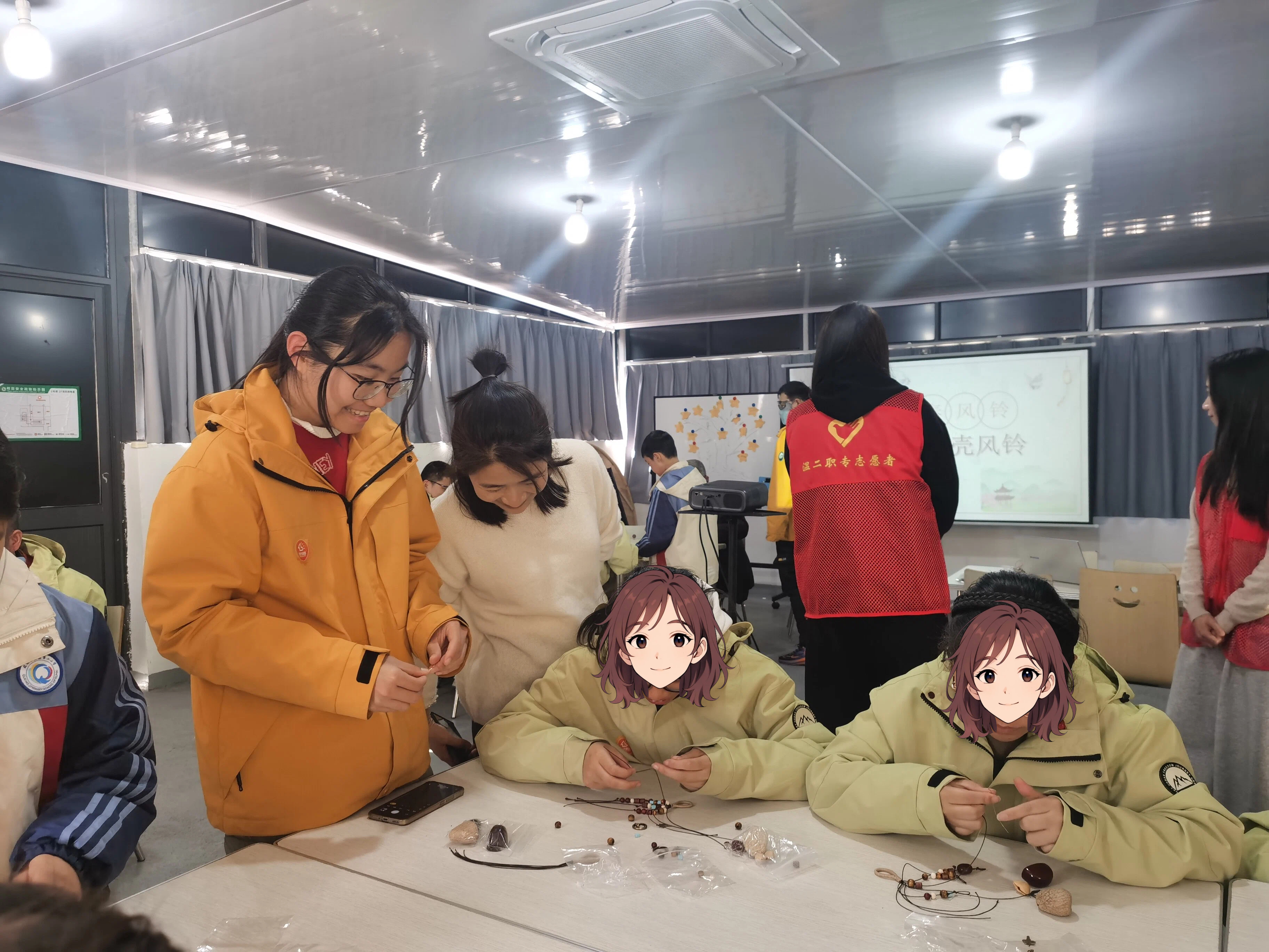 民进瓯海区基层委一支部主委、瞿溪第二小学校长潘建娟和瞿溪第二小学杨晓晓老师,带领学生们与机构学员围坐在一起,共同制作果壳风铃,大家分工协作、巧手搭配,将普通的果壳变成了精致的手工制品,现场欢声笑语不断,暖意浓浓。